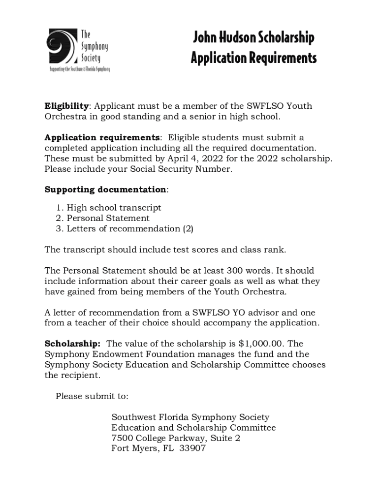John Hudson Scholarship Application Requirements Eligibility: Applicant must be a member of the ALSO Youth Orchestra in good standing and a senior in high school. Application requirements: Eligible
