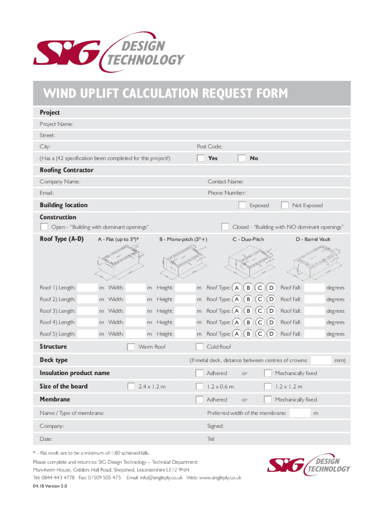 WIND UPLIFT CALCULATION REQUEST FORMProjectProject Name:Street:City:Post Code:(Has a J42 specification been completed for this project?) Roofing ContractorCompany Name:Noncontact Name:Email:Response