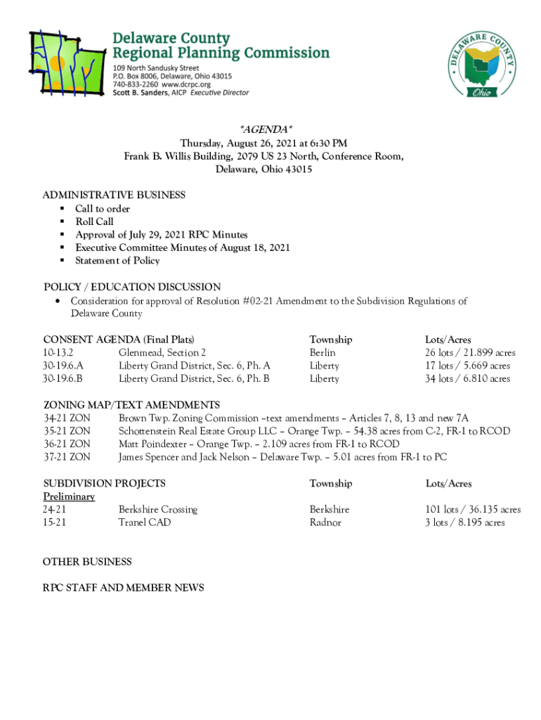 *AGENDA* Thursday, August 26, 2021, at 6:30 PM Frank B. Willis Building, 2079 US 23 North, Conference Room, Delaware, Ohio 43015 ADMINISTRATIVE BUSINESS Call to order Roll Call Approval of July 29,