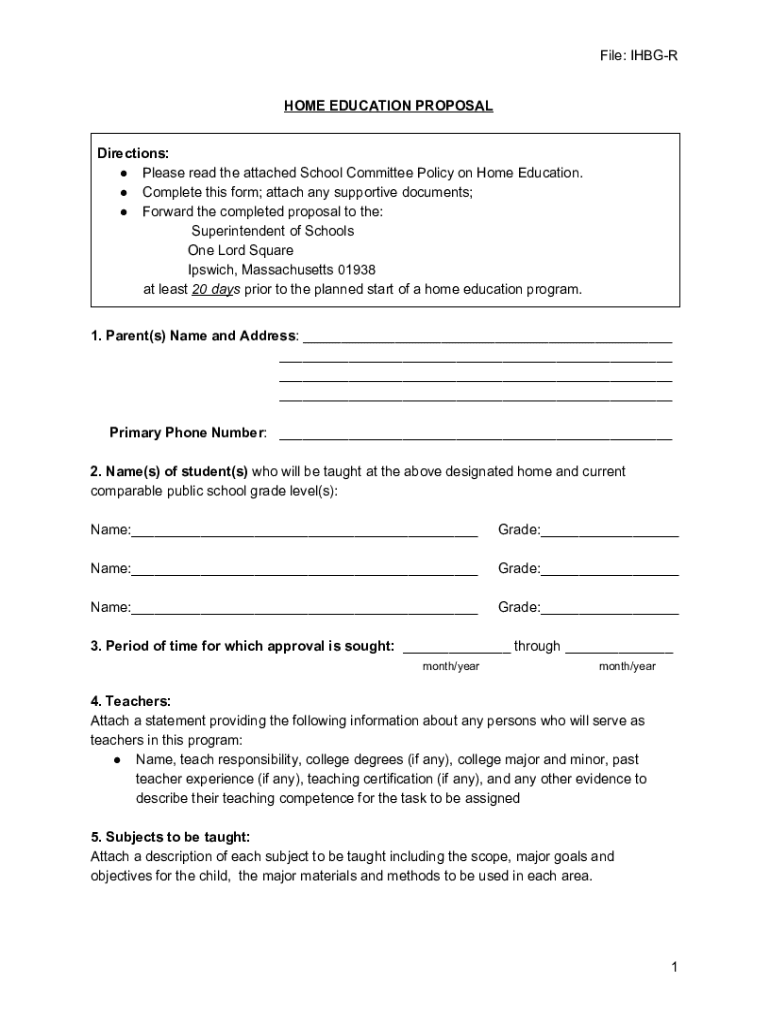 The home school proposal form is a document that must be submitted to the relevant authorities in order to establish a home school program.
