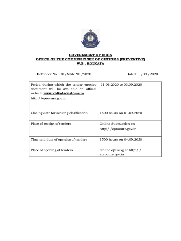 GOVERNMENT OF INDIA OFFICE OF THE COMMISSIONER OF CUSTOMS (PREVENTIVE) W.B., KOLKATA Tender No. 01/MARINE /2020 Period during which the tender inquiry document will be available on official website