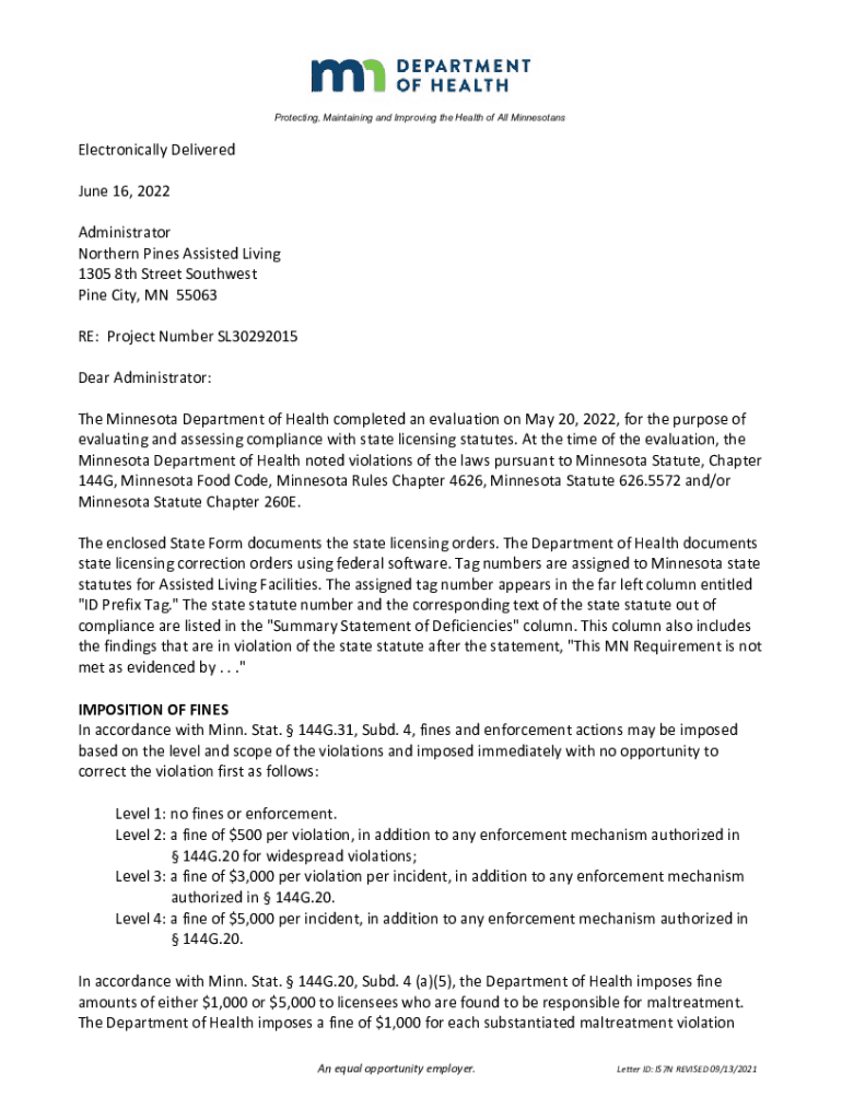 TheMinnesotaDepartmentofHealthcompletedanevaluationonMay20,2022,forthepurposeof