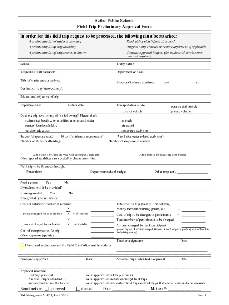 Ethel Public Schools Field Trip Preliminary Approval Form In order for this field trip request to be processed, the following must be attached: A preliminary list of students attending Fundraising
