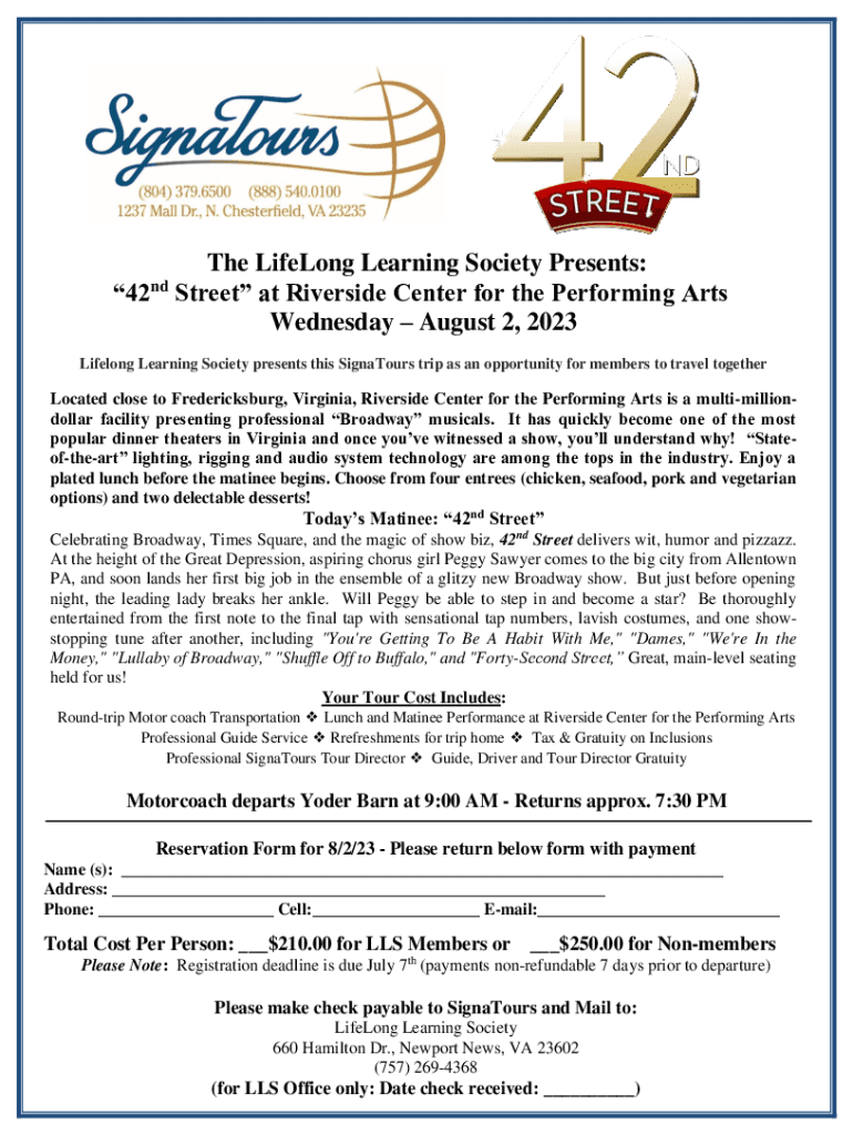 The Lifelong Learning Society Presents: 42 Street at Riverside Center for the Performing Arts Wednesday, August 2, 2023, lifelong Learning Society presents this Signature trip as an opportunity for