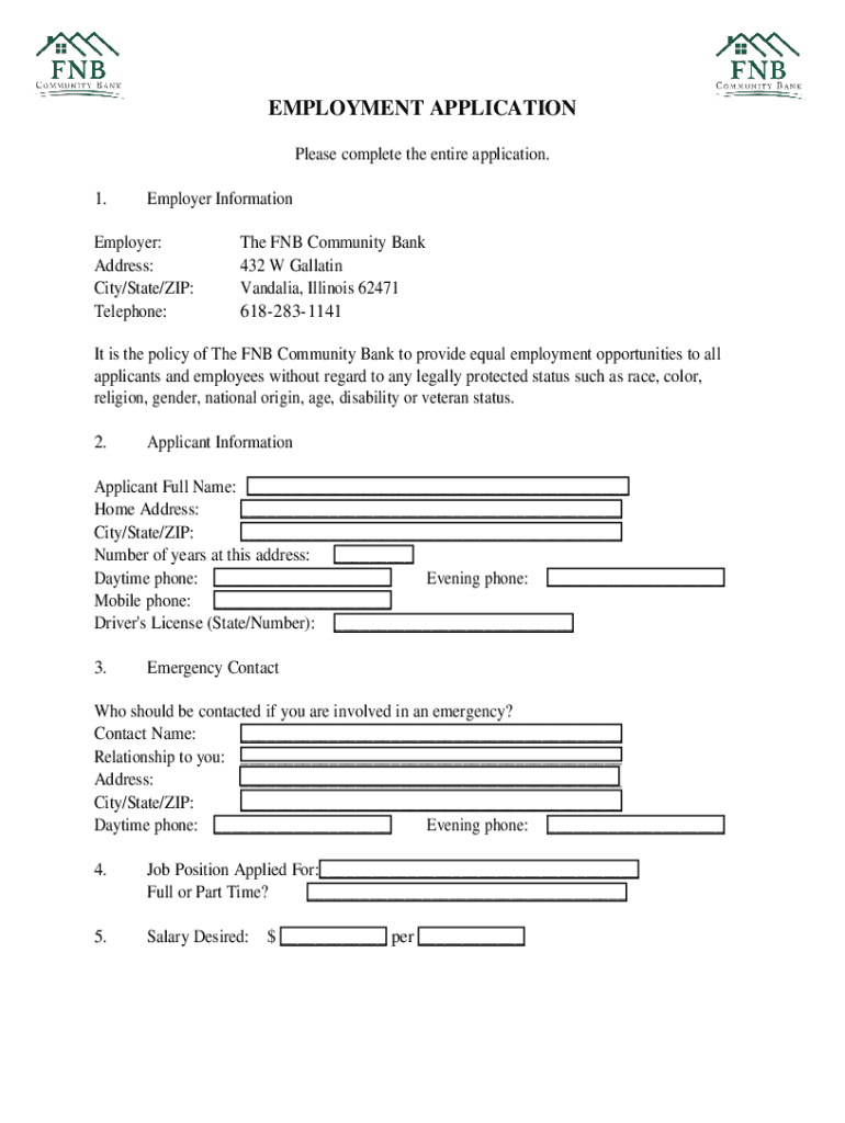 EMPLOYMENT APPLICATION Please complete the entire application. 1. Employer Information Employer: The FNB Community Bank Address: 432 W Gallatin City/State/ZIP: Vandalism, Illinois 62471 Telephone: