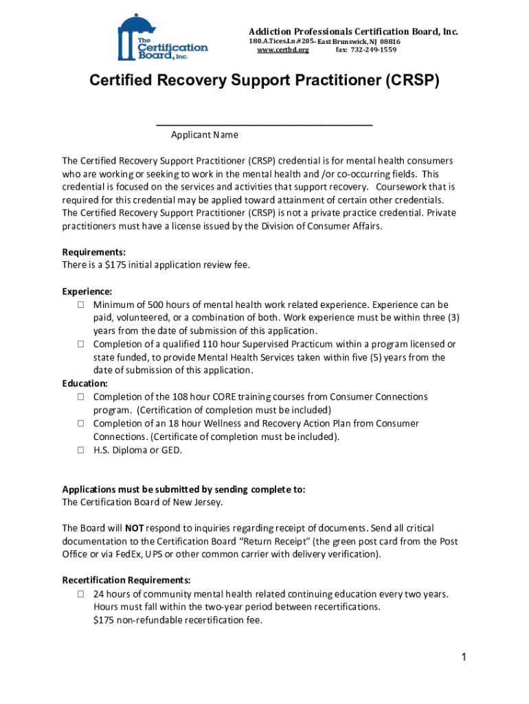 Addiction Professionals Certification Board, Inc. 180. A. Times. Ln.#205 East Brunswick, NJ 08816 www.certbd.org fax: 7322491559Certified Recovery Support Practitioner (CROP) ___ Applicant Name The