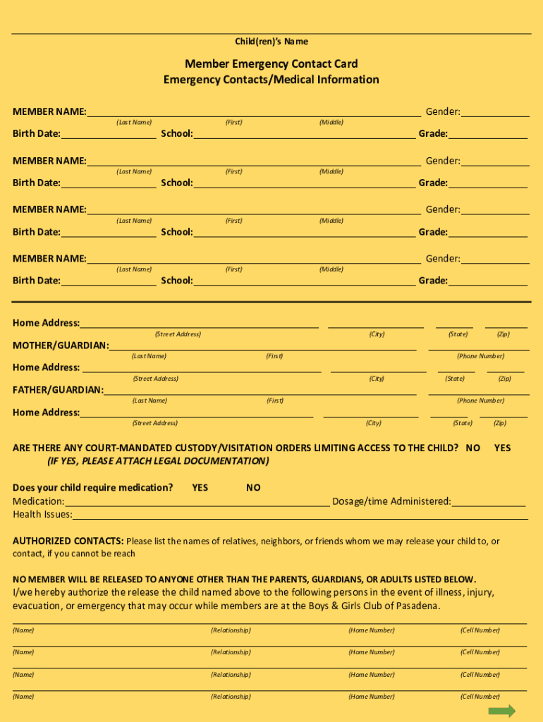 Child(men’s Remember Emergency Contact Card Emergency Contacts/Medical Information MEMBER NAME:___ Gender:___ (Last Name)(First)(Middle)Birth Date:___ School:___ Grade:___ MEMBER NAME:___ Gender:___
