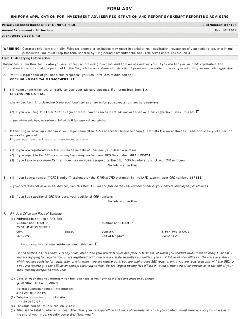 FORM ADV UNIFORM APPLICATION FOR INVESTMENT ADVISER REGISTRATION AND REPORT BY EXEMPT REPORTING ADVISERS Primary Business Name: GREYHOUND CAPITAL CRD Number: 317186Annual Amendment All Sections Rev.