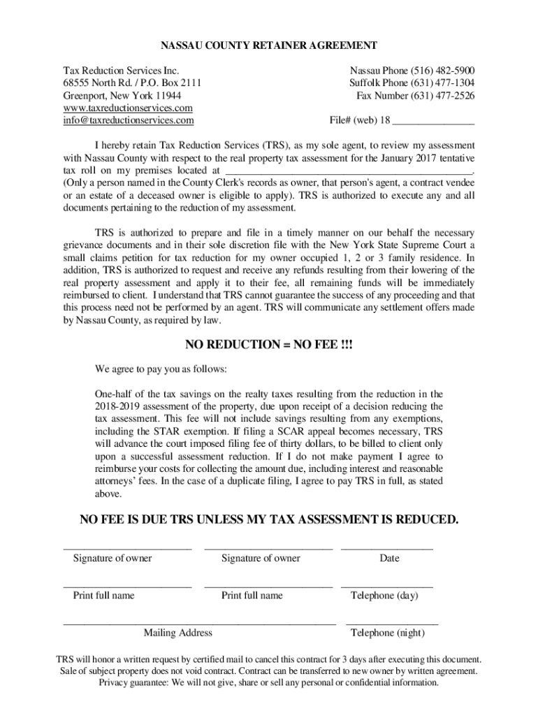 NASSAU COUNTY RETAINER AGREEMENT Tax Reduction Services Inc. 68555 North Rd. / P.O. Box 2111 Green port, New York 11944 www.taxreductionservices.com info@taxreductionservices.comNassau Phone (516)