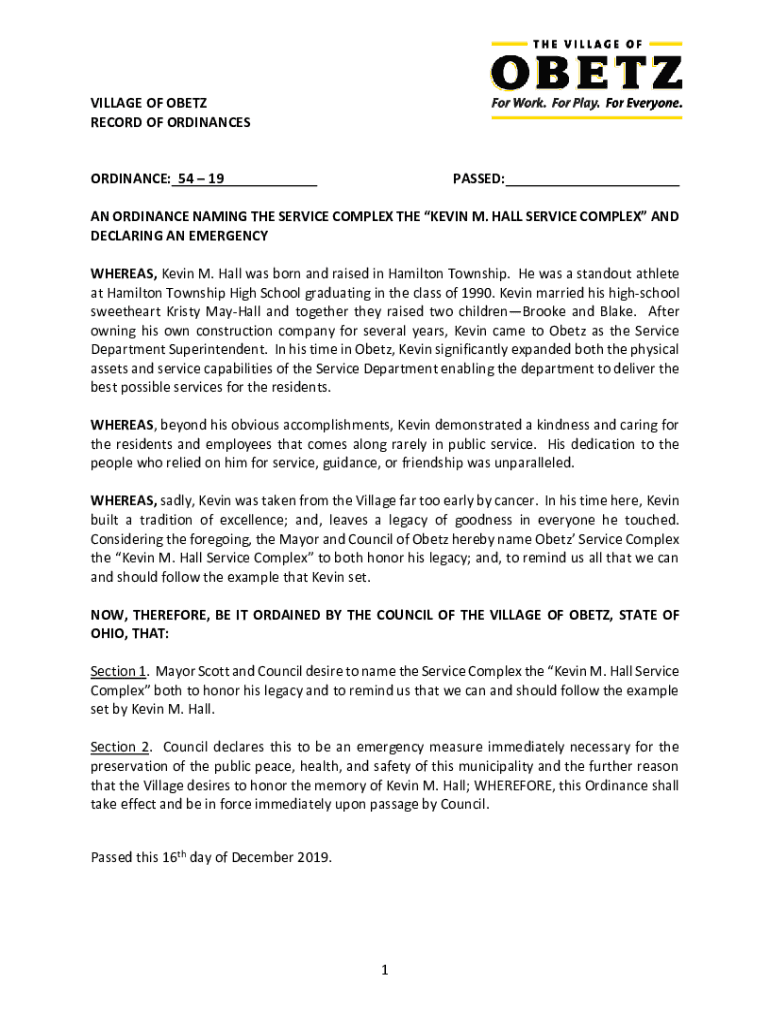 VILLAGE OF OB ETZ RECORD OF ORDINANCESORDINANCE: 54 19PASSED:AN ORDINANCE NAMING THE SERVICE COMPLEX THE KEVIN M. HALL SERVICE COMPLEX AND DECLARING AN EMERGENCY WHEREAS, Kevin M. Hall was born and