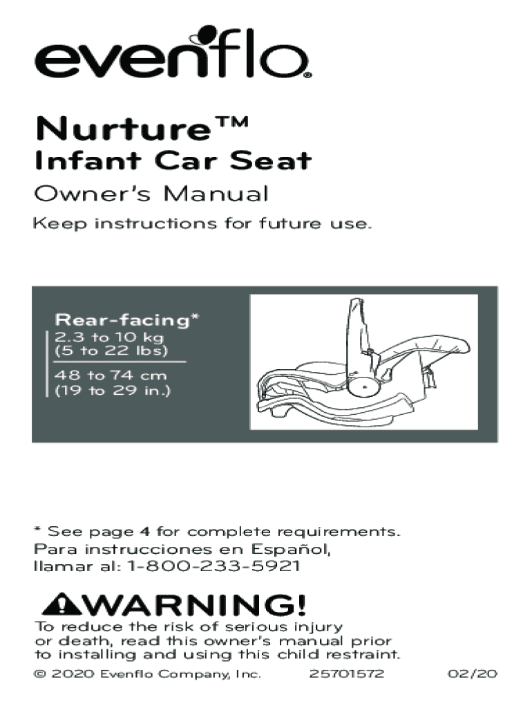 NurtureInfant Car Seat Owners Manual Keep instructions for future use. Rear facing* 2.3 to 10 kg (5 to 22 lbs)48 to 74 cm (19 to 29 in.)* See page 4 for complete requirements. Para instructions en