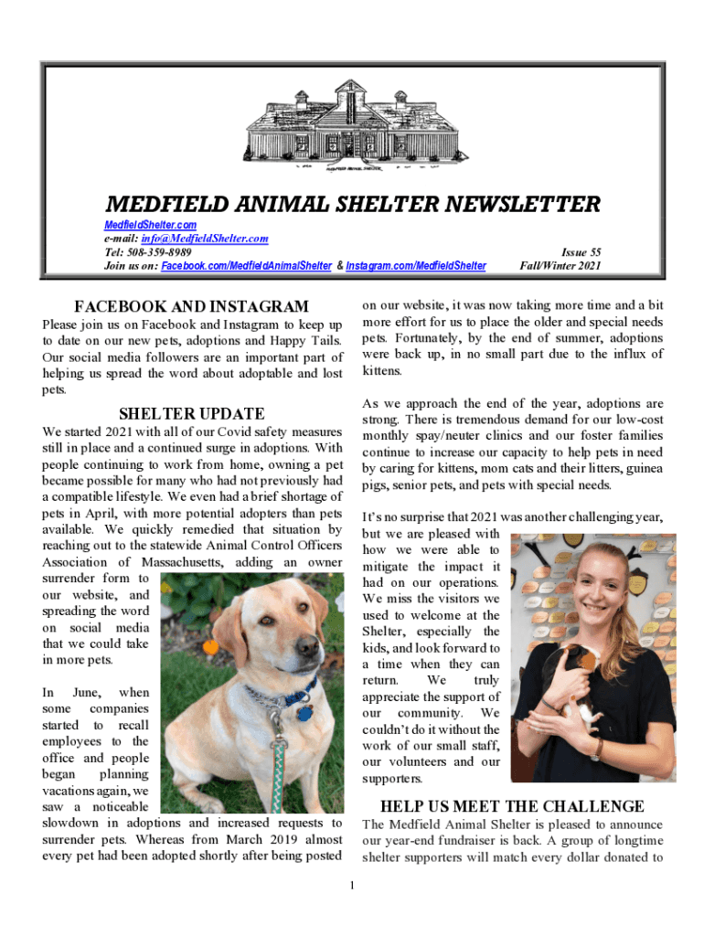 MIDFIELD ANIMAL SHELTER NEWSLETTERMedfieldShelter.com email: info@MedfieldShelter.com Tel: 5083598989 Join us on: Facebook.com/MedfieldAnimalShelter & Instagram.com/MedfieldShelterIssue 55 Fall/Winter
