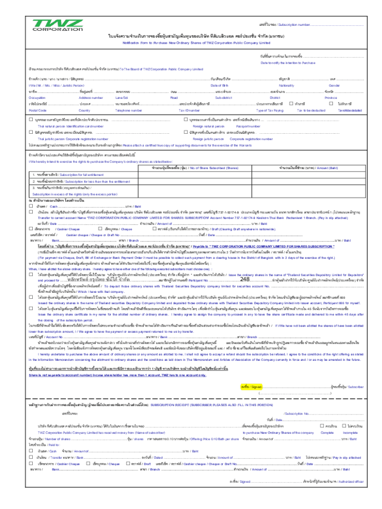 / Subscription number () Notification Form to Purchase New Ordinary Shares of TWO Corporation Public Company Limited