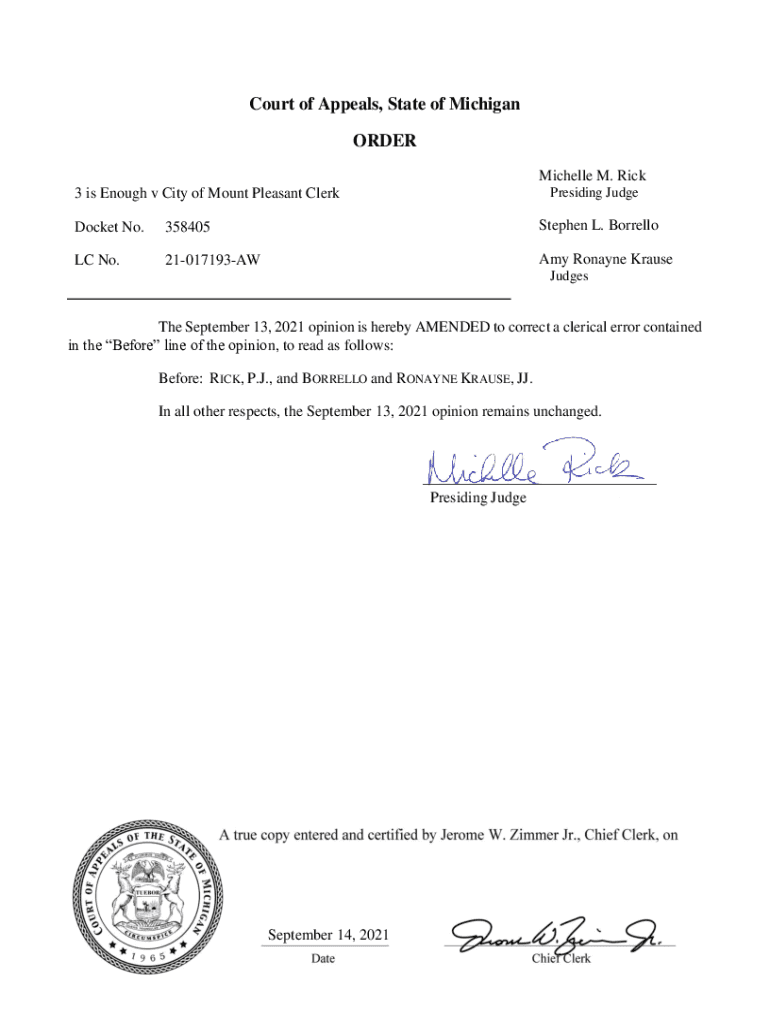 Court of Appeals, State of Michigan ORDER Michelle M. Rick Presiding Judge3 is Enough v City of Mount Pleasant Clerk Docket No.358405Stephen L. Bordello No.21017193AWAmy Roxanne Krause Judges September