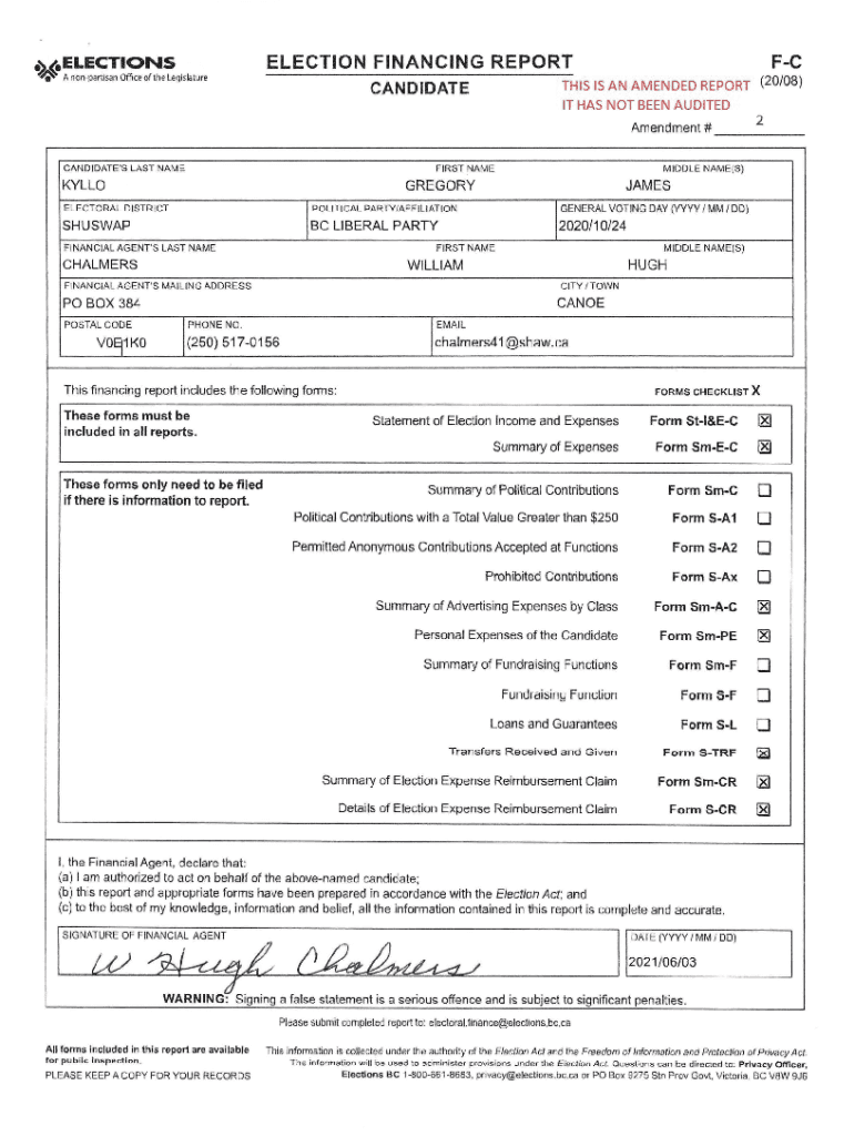 (20/08)CANDIDATEAmendment# _ _ _2_ __CANDIDATE\'S LAST NAMEFIRST NAMEKYLLOGREGORYIPOLITI CAL PARTY/AFFILIATIONSHUSWAPGENERAL VO TING DAY (YYY / MM/ DD)2020/10/24BC LIBERAL