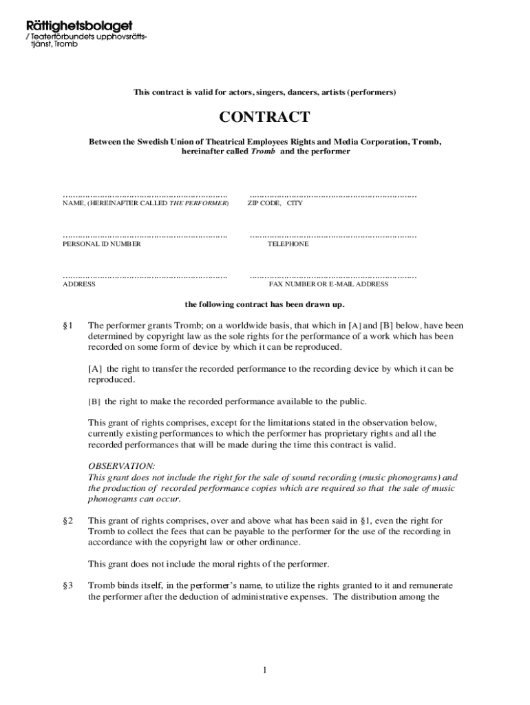 This contract is valid for actors, singers, dancers, artists (performers)CONTRACT Between the Swedish Union of Theatrical Employees Rights and Media Corporation, Tomb, hereinafter called Tomb and