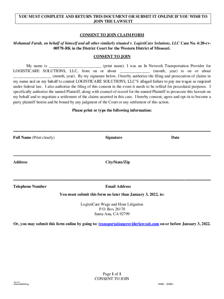 YOU MUST COMPLETE AND RETURN THIS DOCUMENT OR SUBMIT IT ONLINE IF YOU WISH TO JOIN THE LAWSUIT CONSENT TO JOIN CLAIM FORM Mohamad Farah, on behalf of himself and all other similarly situated v. Logistical