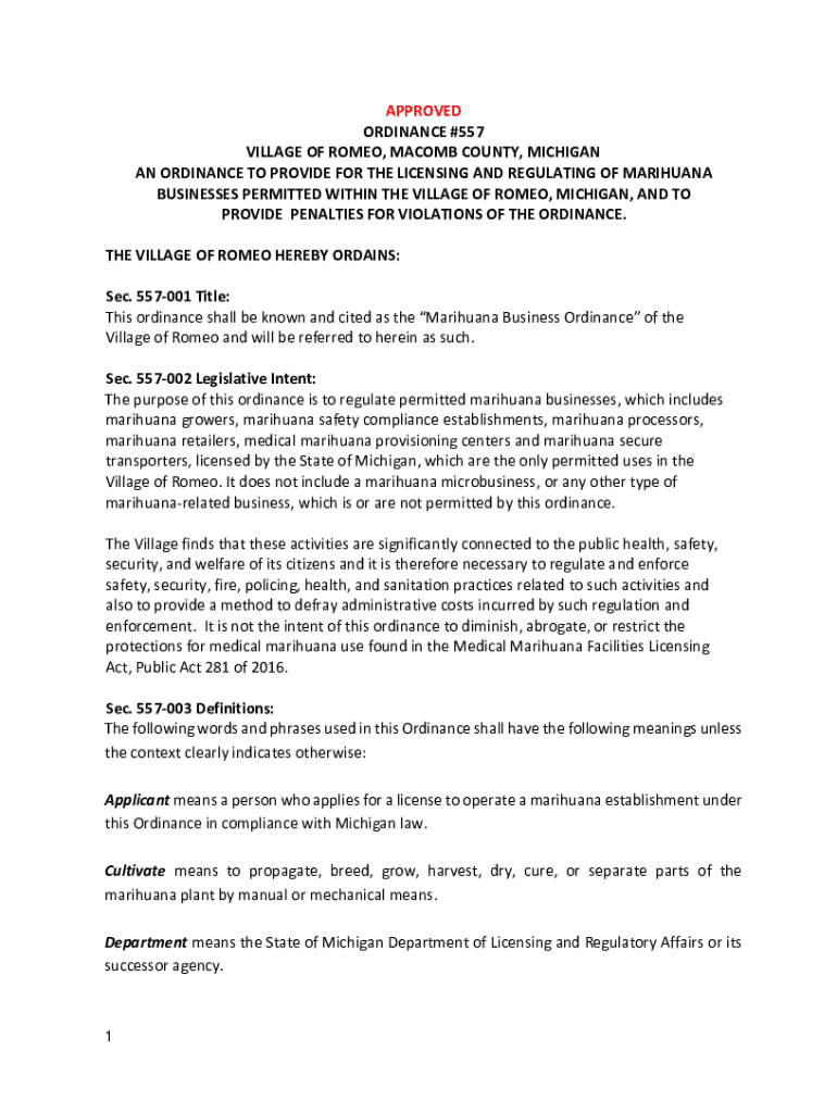 APPROVED ORDINANCE #557 VILLAGE OF ROMEO, MACOMB COUNTY, MICHIGAN AN ORDINANCE TO PROVIDE FOR THE LICENSING AND REGULATING OF MARIJUANA BUSINESSES PERMITTED WITHIN THE VILLAGE OF ROMEO, MICHIGAN,