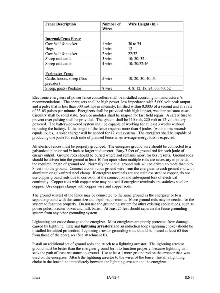 NATURAL RESOURCES CONSERVATION SERVICE CONSTRUCTION SPECIFICATION IA-92. FENCES 1. SCOPE The work shall consist of furnishing and installing fences, including gates and fittings. 2. STANDARD FENCE