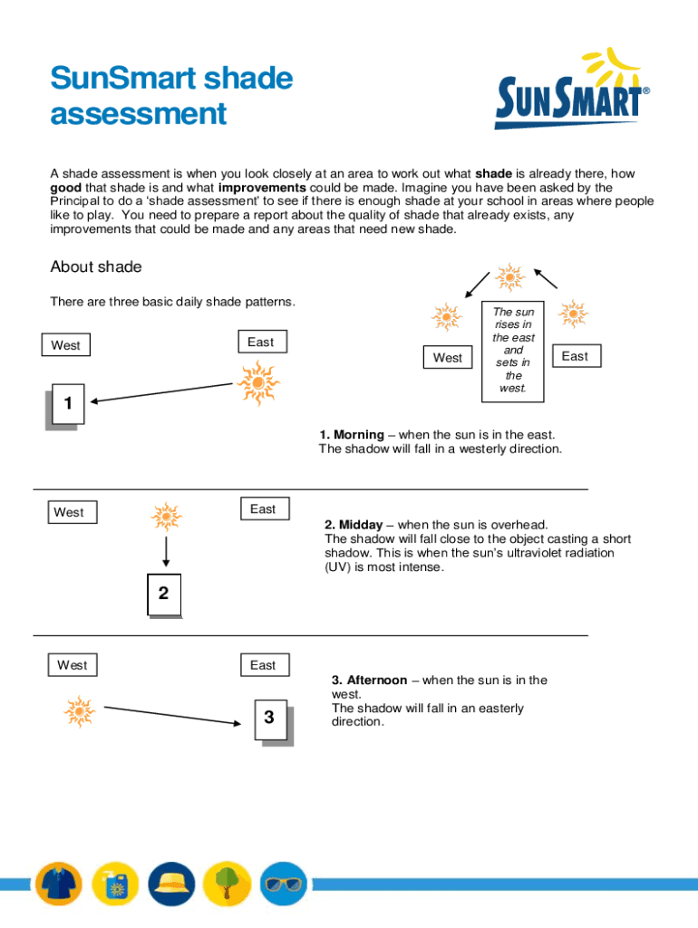 Sun Smart shade assessment A shade assessment is when you look closely at an area to work out what shade is already there, how good that shade is and what improvements could be made. Imagine you have