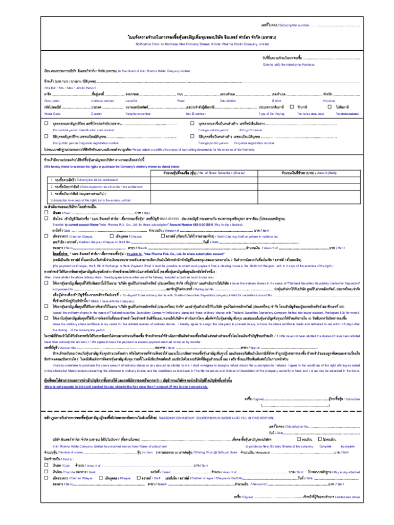 Subscription numberNotification Form to Purchase New Ordinary Shares of Inter Pharma Public Company Limited.