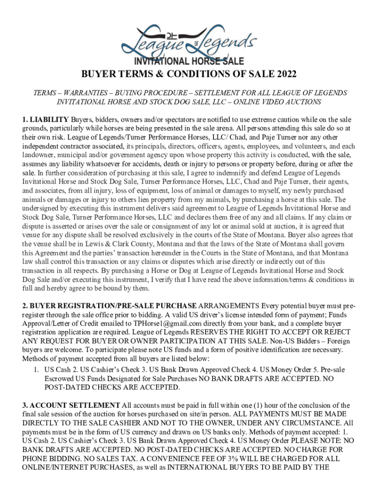 BUYER TERMS & CONDITIONS OF SALE 2022 TERMS WARRANTIES BUYING PROCEDURE SETTLEMENT FOR ALL LEAGUE OF LEGENDS INVITATIONAL HORSE AND STOCK DOG SALE, LLC ONLINE VIDEO AUCTIONS 1. LIABILITY Buyers, bidders,