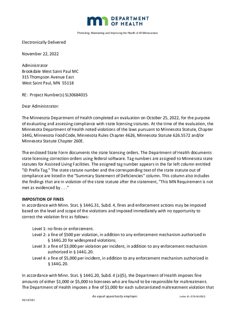 Protecting, Maintaining and Improving the Health of All MinnesotansElectronically Delivered November 22, 2022, Administrator Brook dale West Saint Paul MC 315 Thompson Avenue East West Saint Paul,