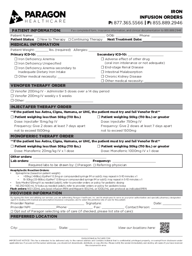 IRON INFUSION ORDERS P: 877.365.5566 | F: 855.889.2946 PATIENT INFORMATION:Fax completed form, insurance information, and clinical documentation to 855.889.2946Patient Name: ___ DOB: ___ Phone: ___