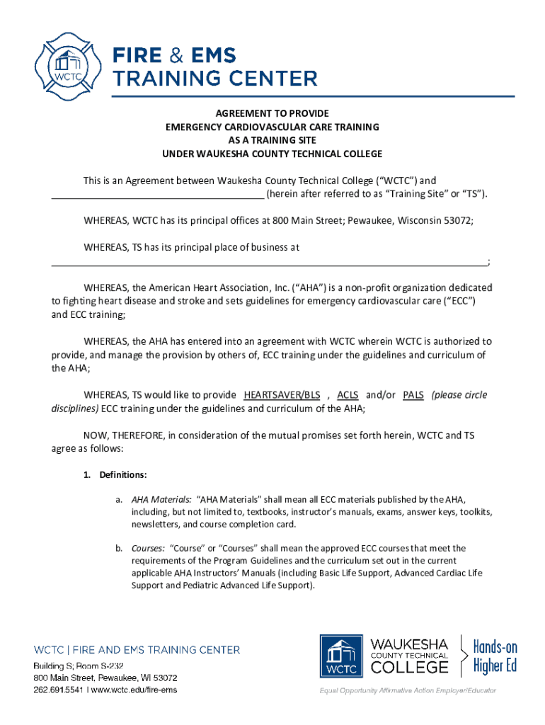 AGREEMENT TO PROVIDE EMERGENCY CARDIOVASCULAR CARE TRAINING AS A TRAINING SITE UNDER WAUKESHA COUNTY TECHNICAL COLLEGE This is an Agreement between Waukesha County Technical College (CTC) and ___