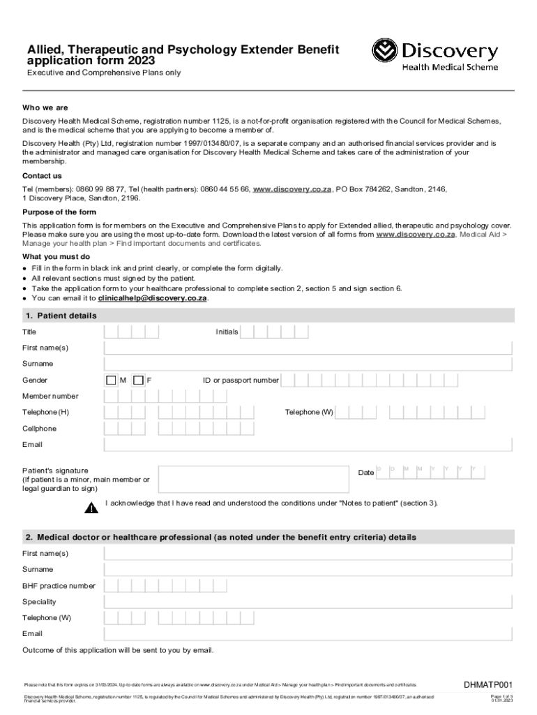 Allied, Therapeutic and Psychology Extender Benefit application form 2023 ExecutiveandComprehensivePlansonlyWho we are DiscoveryHealthMedicalScheme,registrationnumber1125,isanotforprofitorganisationregisteredwiththeCouncilforMedicalSchemes,
