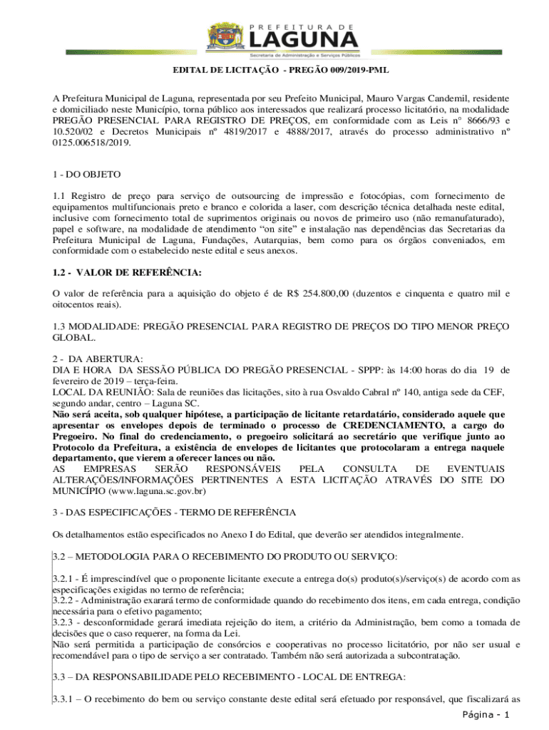 EDIT AL DE LICIT AO PRESO 009/2019PMLA Prefecture Municipal de Laguna, represented POR SEU Predator Municipal, Mauro Vargas Pandemic, residents