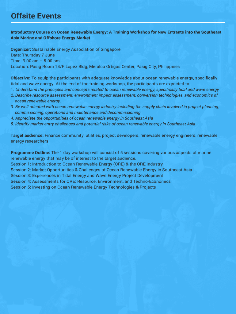 Offsite Events Introductory Course on Ocean Renewable Energy: A Training Workshop for New Entrants into the Southeast Asia Marine and Offshore Energy Market Organizer: Sustainable Energy Association