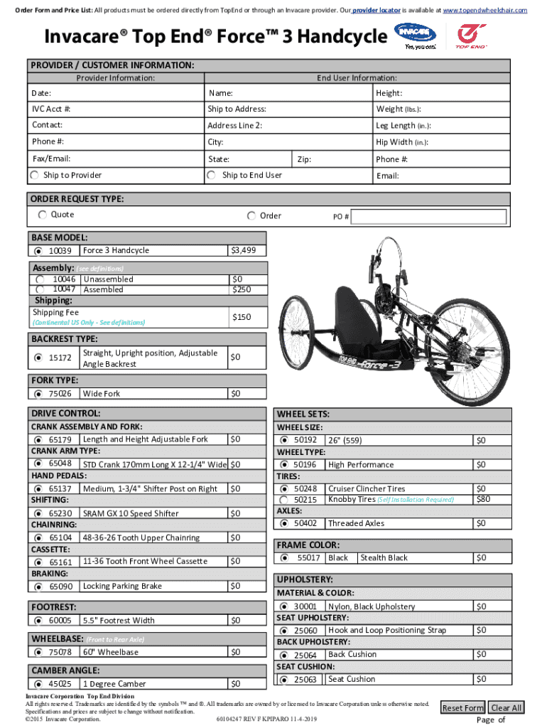 Order Form and Price List: All products must be ordered directly from Open or through an Invader provider. Our provider locator is available at www.topendwheelchair.comInvacare Top End Force 3 Hand