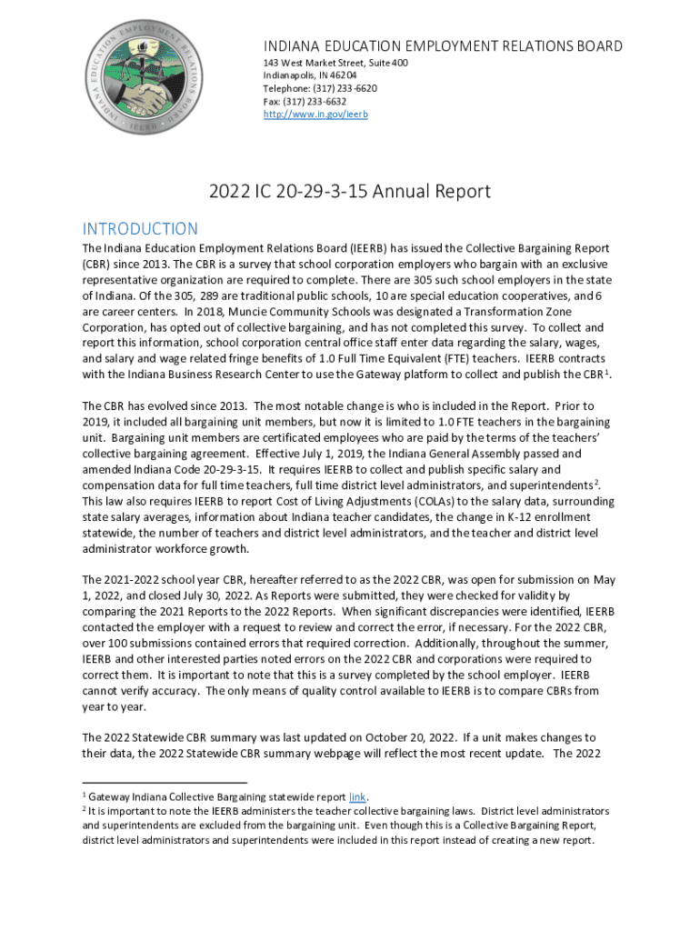 INDIANA EDUCATION EMPLOYMENT RELATIONS BOARD 143 West Market Street, Suite 400 Indianapolis, IN 46204 Telephone: (317) 2336620 Fax: (317) 2336632 http://www.in.gov/ieerb2022 IC 2029315 Annual Report