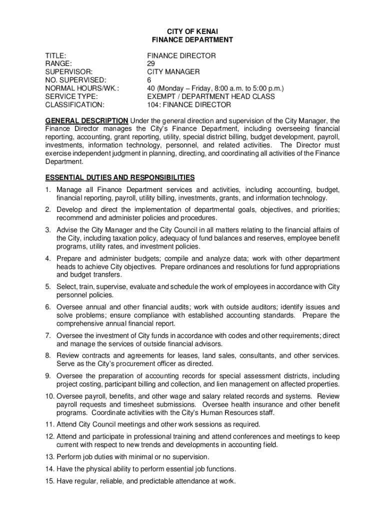 CITY OF KEN AI FINANCE DEPARTMENT TITLE: RANGE: SUPERVISOR: NO. SUPERVISED: NORMAL HOURS/WK.: SERVICE TYPE: CLASSIFICATION:FINANCE DIRECTOR 29 CITY MANAGER 6 40 (Monday Friday, 8:00 a.m. to 5:00 p.m.)