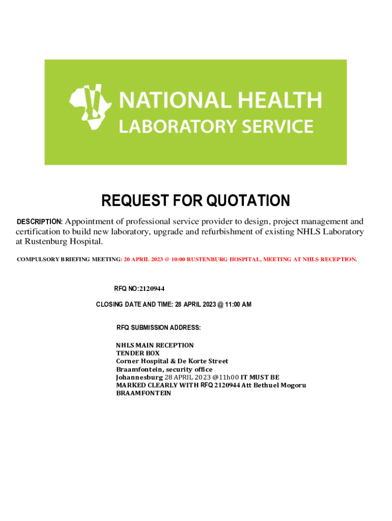 REQUEST FOR QUOTATION DESCRIPTION: Appointment of professional service provider to design, project management and certification to build new laboratory, upgrade and refurbishment of existing NHS Laboratory