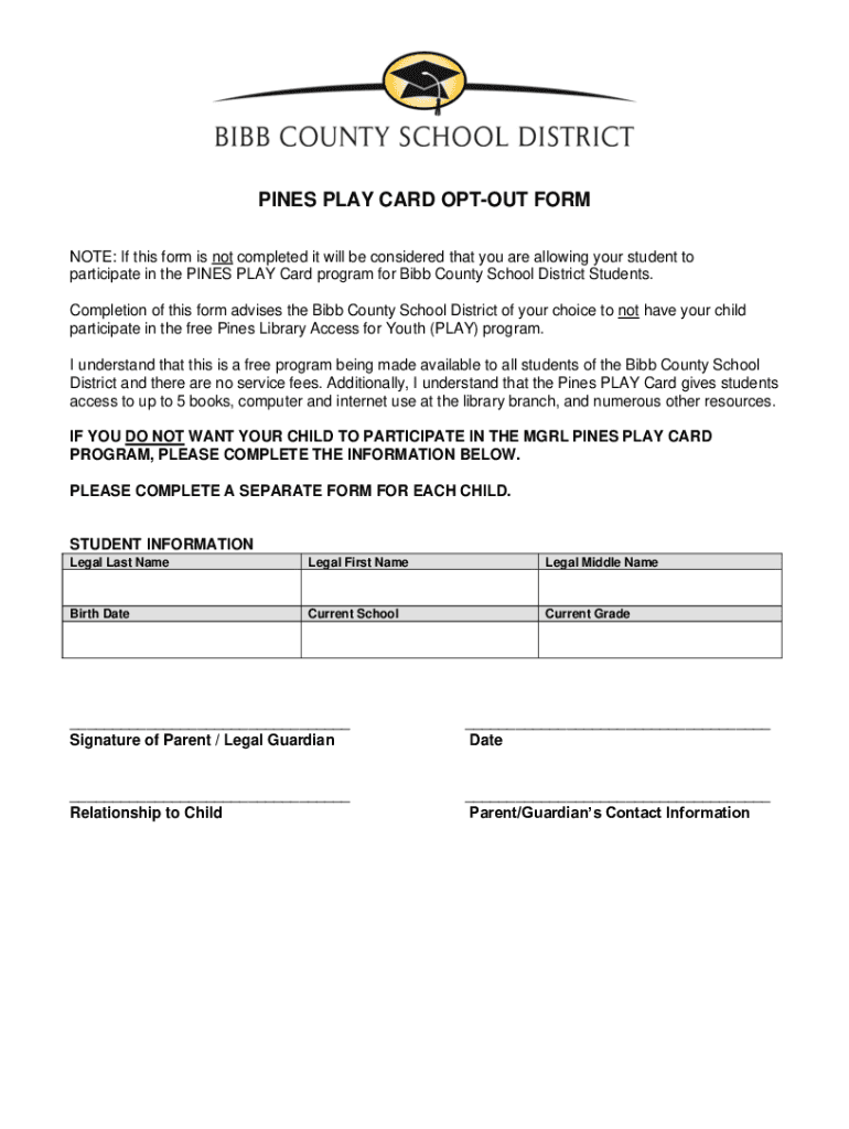 PINES PLAY CARD OPT-OUT FORM NOTE: If this form is not completed it will be considered that you are allowing your student to participate in the PINES PLAY Card program for BBB County School District