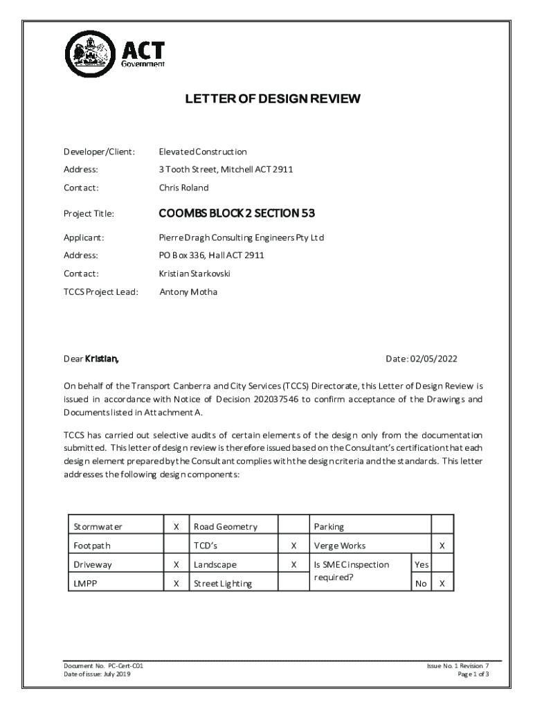 Get the free LETTER OF DESIGN REVIEW COOMBS BLOCK 2 SECTION 53