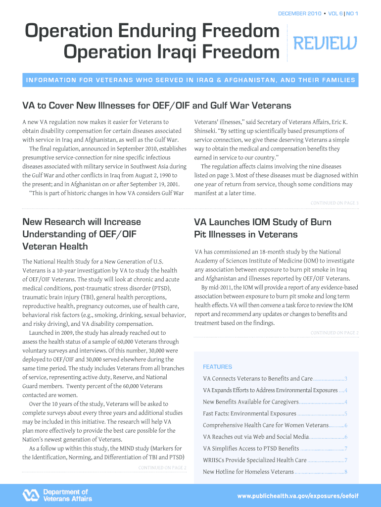 DECEMBER 2010 Vol 6 NO 1 Operation Enduring Freedom Operation Iraqi Freedom Information FOR Veterans who served IN Iraq & Afghanistan, and their Families Va to Cover New Illnesses for OF/OF and Gulf