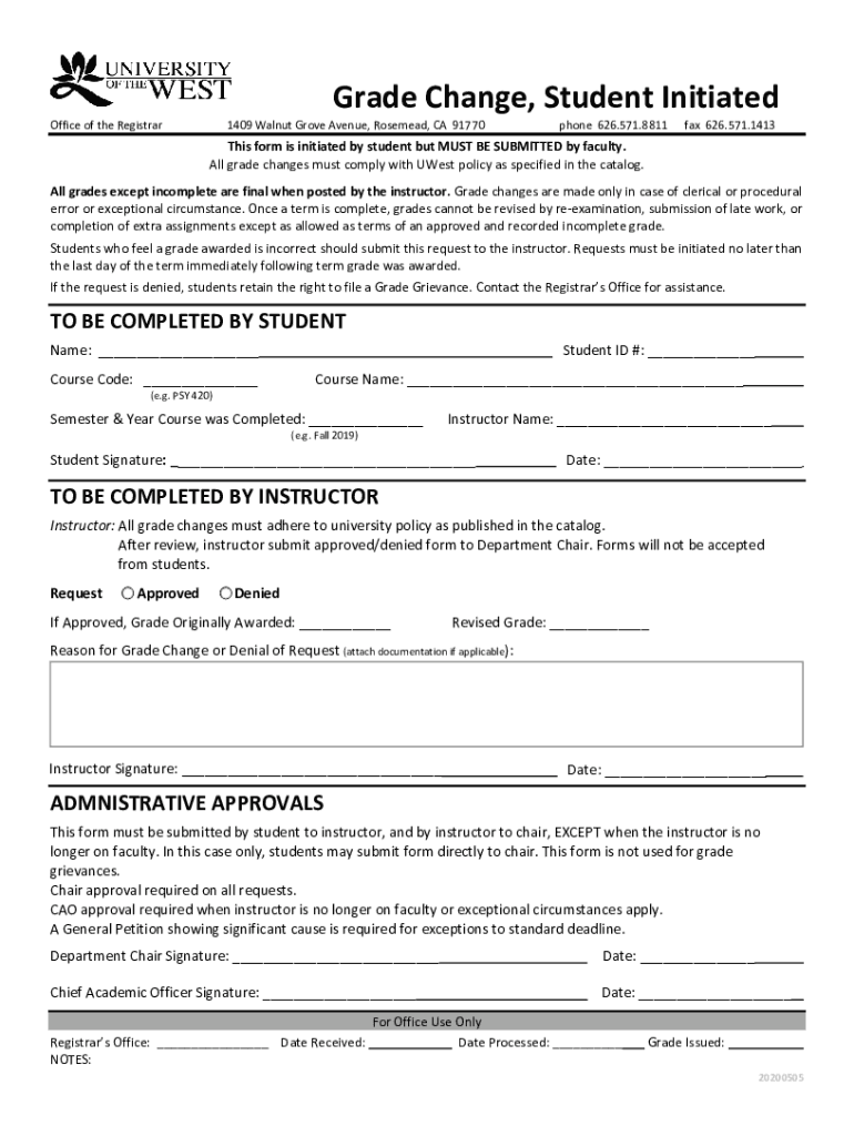 Grade Change, Student InitiatedOffice of the Registrar1409 Walnut Grove Avenue, Rose mead, CA 91770phone 626.571.8811fax 626.571.1413This form is initiated by student but MUST BE SUBMITTED by faculty.