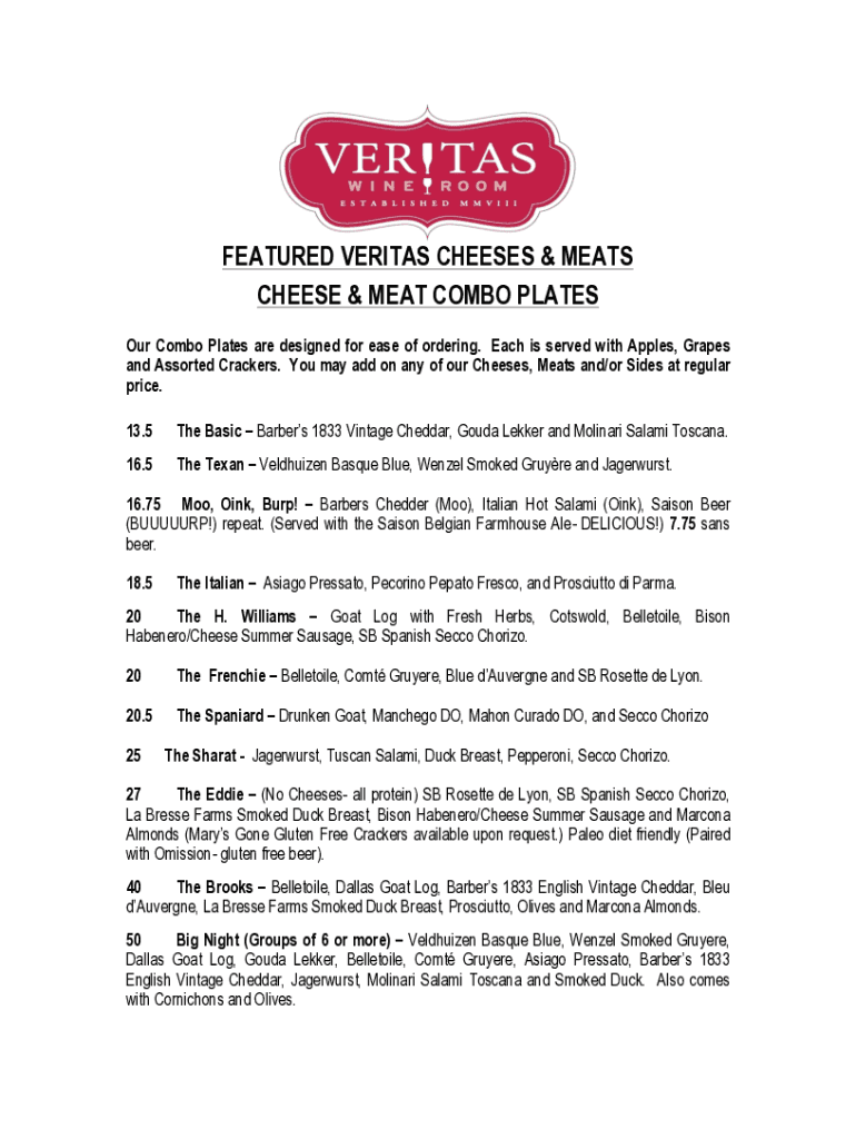 FEATURED MERITS CHEESES & MEATS CHEESE & MEAT COMBO PLATES Our Combo Plates are designed for ease of ordering. Each is served with Apples, Grapes and Assorted Crackers. You may add on any of our Cheeses,