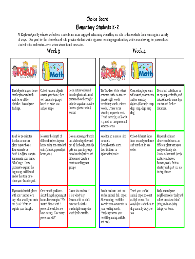 Choice Board Elementary Students K2 At Ray town Quality Schools we believe students are more engaged in learning when they are able to demonstrate their learning in a variety of ways. Our goal for