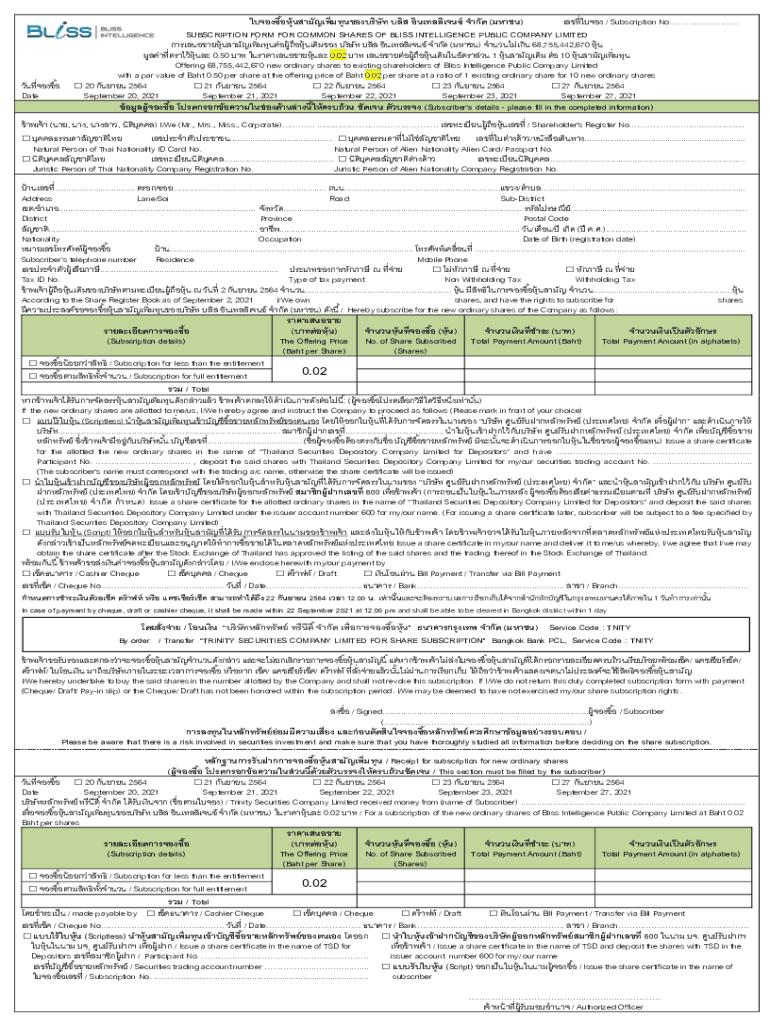 Date () / Subscription No. SUBSCRIPTION FORM FOR COMMON SHARES OF BLISS INTELLIGENCE PUBLIC COMPANY LIMITED ()