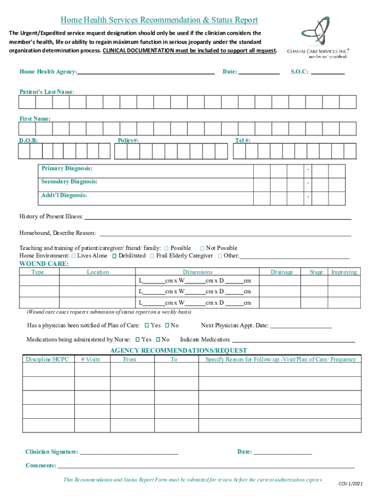 Home Health Services Recommendation & Status Report The Urgent/Expedited service request designation should only be used if the clinician considers the members' health, life or ability to regain maximum