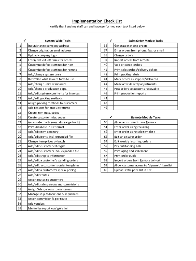 Implementation Check List I certify that my staff and I can and have performed each task listed below. ___ 1 2 3 4 5 6 7 8 9 10 11 12 13 14 15 16 17 18 19 20 21 22 23 24 25 26 27 28 29 30 31 32 33