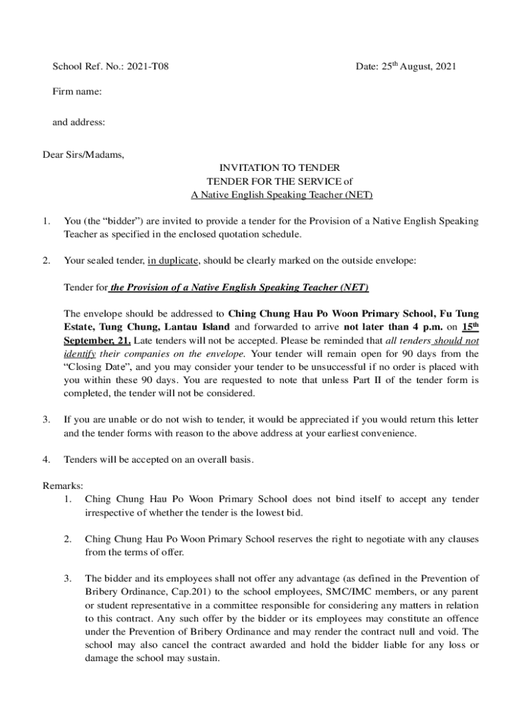 Date: 25th August, 2021School Ref. No.: 2021T08 Firm name: and address: Dear Sirs/Madams, INVITATION TO TENDER FOR THE SERVICE of A Native English-speaking Teacher (NET) 1. You (the bidder) are invited
