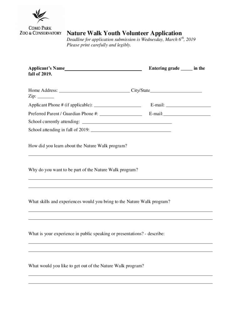 Nature Walk Youth Volunteer ApplicationDeadline for application submission is Wednesday, March 6th, 2019 Please print carefully and legibly. Applicants Name fall of 2019. Entering grade ___ in theme