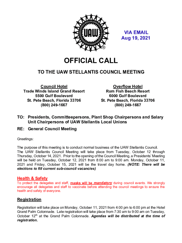 VIA EMAIL Aug 19, 2021OFFICIAL CALL TO THE UAW STELLANTIS COUNCIL MEETING Council HotelTrade Winds Island Grand Resort 5500 Gulf Boulevard St. Pete Beach, Florida 33706 (800) 2491667Overflow Hotel