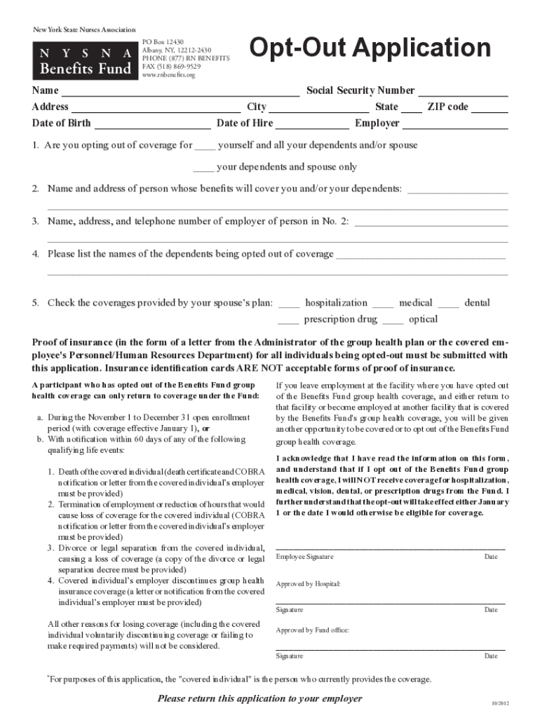 New York State Nurses AssociationNYSNABenefits Fund PO Box 12430 Albany, NY, 122122430 PHONE (877) RN BENEFITS FAX (518) 8699529 www.rnbenefits.orgOptOut ApplicationName ___ Social Security Number