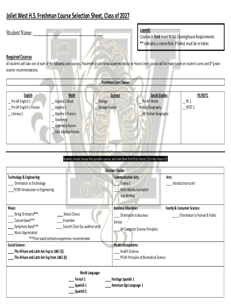 Joliet West H.S. Freshman Course Selection Sheet, Class of 2027 Legend: Courses in Bold meet NCAA Clearinghouse Requirements ** indicates a course that, if failed, must be retakenStudent Name: ___